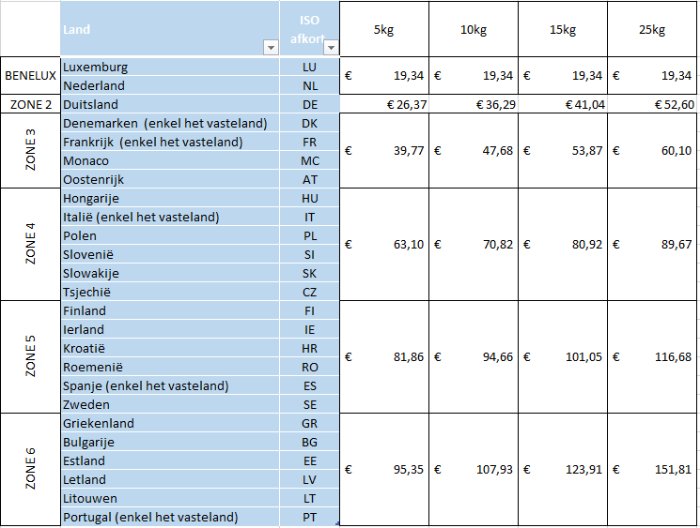 Onderstaande tabel geeft meer uitleg over de geldende tarieven opgedeeld per land en per gewicht.