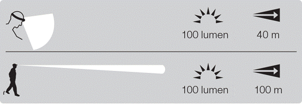 Bij hetzelfde lichtvermogen verschilt de verlichtingsafstand afhankelijk van de vorm van de lichtbundel. Bijvoorbeeld, 100 lumen licht zal tot 40 meter reiken met een zeer brede lichtbundel, maar tot 100 meter met een smalle lichtbundel.