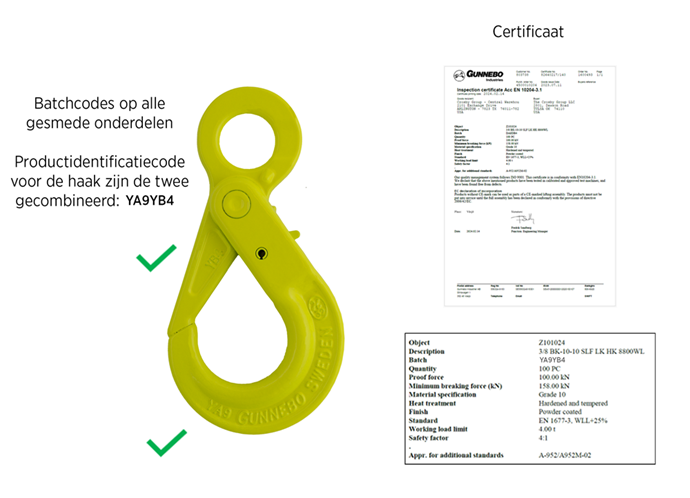 Beide batchcodes die zichtbaar zijn op de body van de haak en de klep worden gecombineerd en vervolgens vermeld op het certificaat. Dit certificaat kan opgevraagd worden in geval van nood.